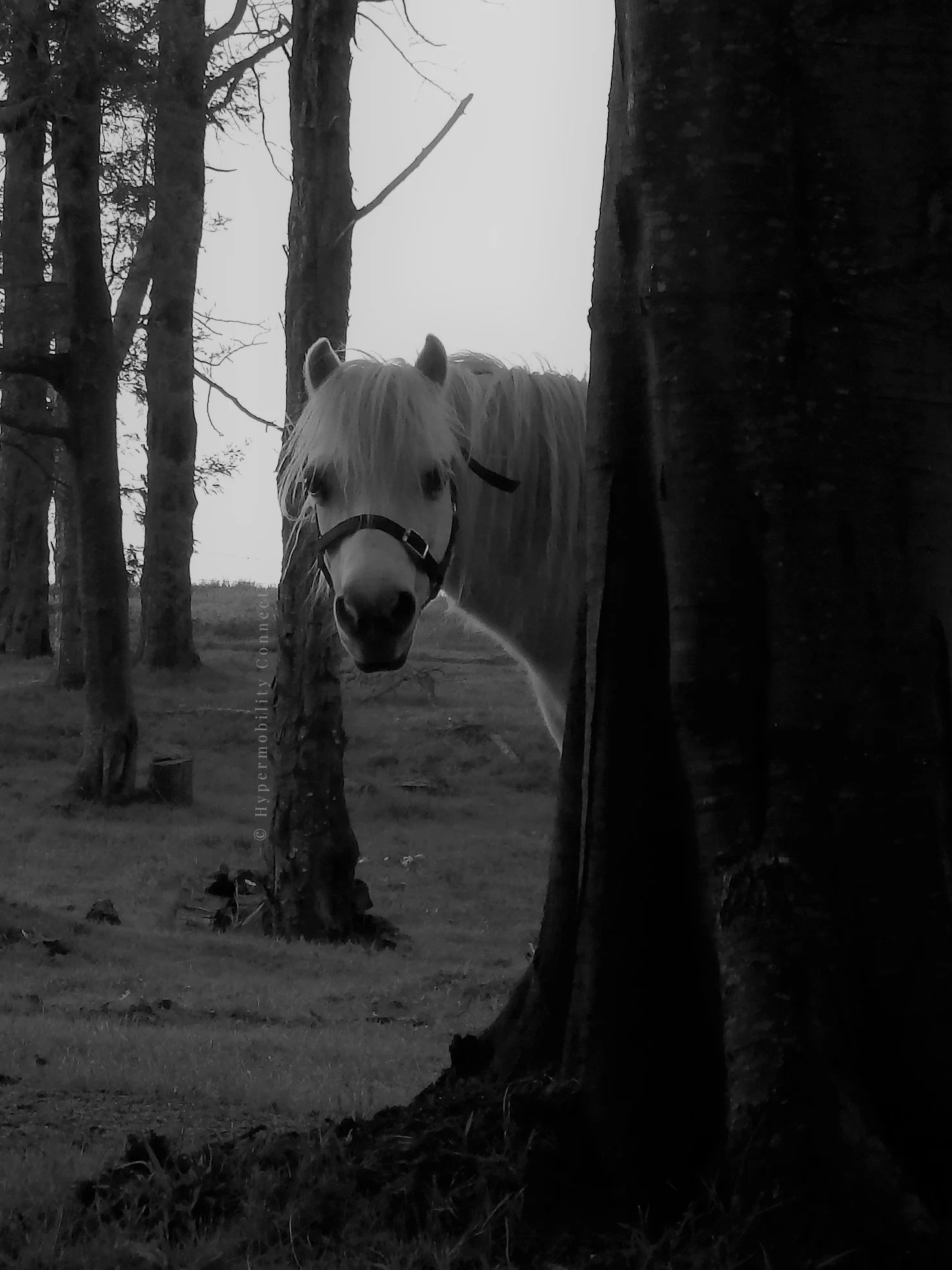 © Hypermobility Connect" Black and white image of a white horse with its head poking out from behind a tree